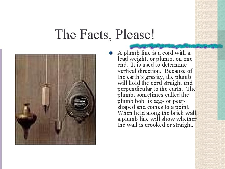 Plumb line - a cord from which a metal weight is suspended pointing directly to the earths center of gravity.